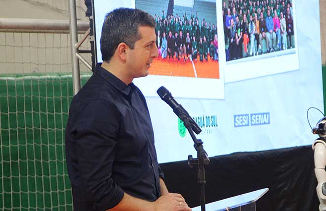 O lançamento oficial aconteceu na tarde de quinta-feira (27), no ginásio do Sesi, com a presença do presidente da Fiesc, Mario Cezar de Aguiar, diretores do Senai e Sesi, empresários, secretários municipais, estudantes e convidados. O chefe de gabinete, João Antônio Berti, representou o prefeito Jair Franzner, que está se recuperando de enfermidade em sua residência.