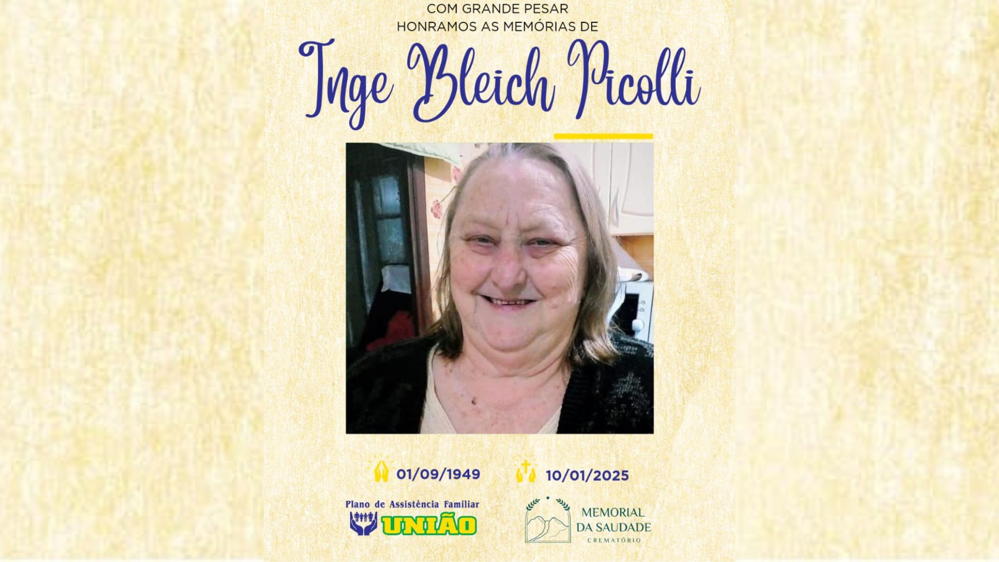 PLANO UNIÃO informa – FALECIMENTO nesta sexta-feira 10/01 A Sra. INGE BLEICH PICOLLI com 75 anos de idade