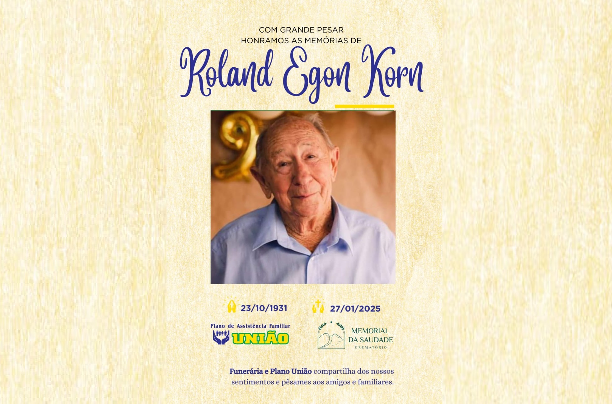 PLANO UNIÃO informa - FALECIMENTO do Sr. ROLAND EGON KORN com 93 anos de idade ocorrido ontem dia 27