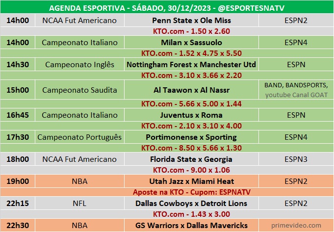 Saiba mais: Confira a agenda esportiva mundial para esse sábado, 30 de dezembro