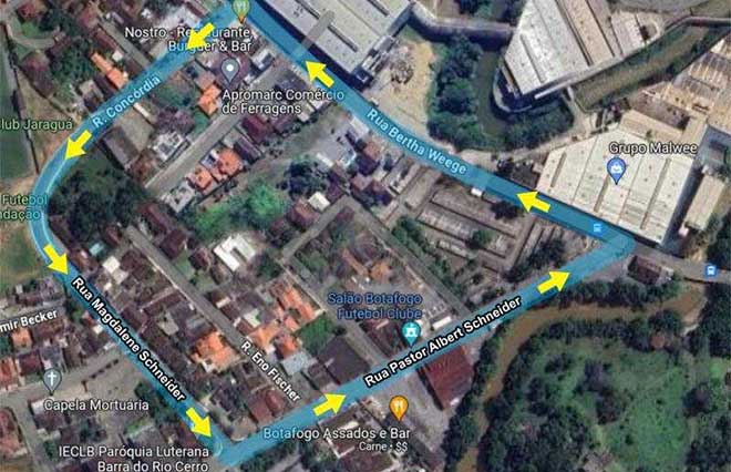 O trecho da Rua Bertha Weege, do cruzamento com a Rua Pastor Albert Schneider (em frente a Malwee), terá o fluxo alterado de mão dupla para mão única no sentido centro/bairro, até a Rua Concórdia.