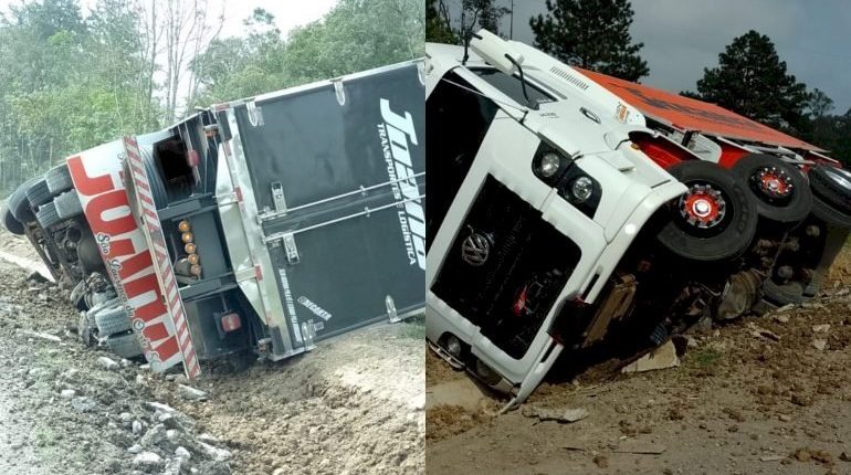Uma carreta, carregada com carne, tombou por volta das 15h desta quarta-feira (27), na BR-470, Serra da Santa, em Pouso Redondo.