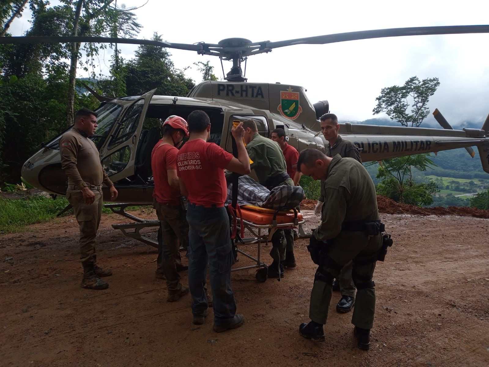 Equipes da Polícia Militar de Schroeder auxiliaram no resgate e contamos com o Apoio da aeronave da PM, Aguia 01 de Joinville.