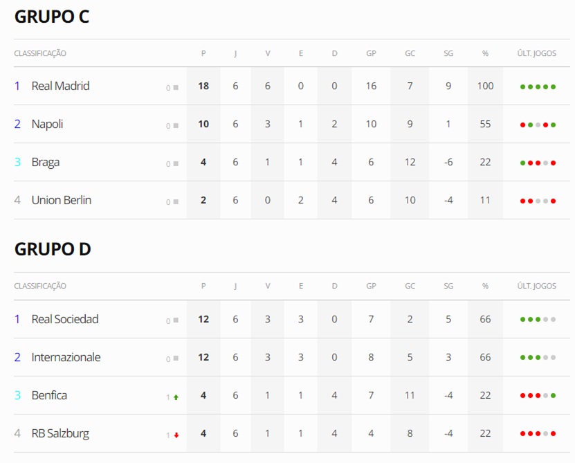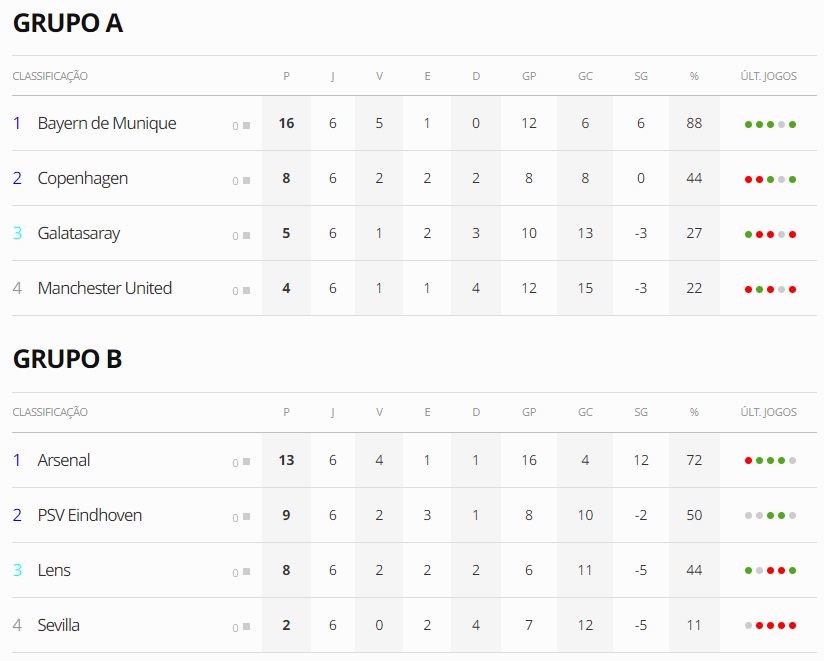 Na tarde desta terça-feira (12), a fase de grupos da UEFA Champions League teve a sua sexta e última rodada com oito jogos nos Grupos A, B, C e D.