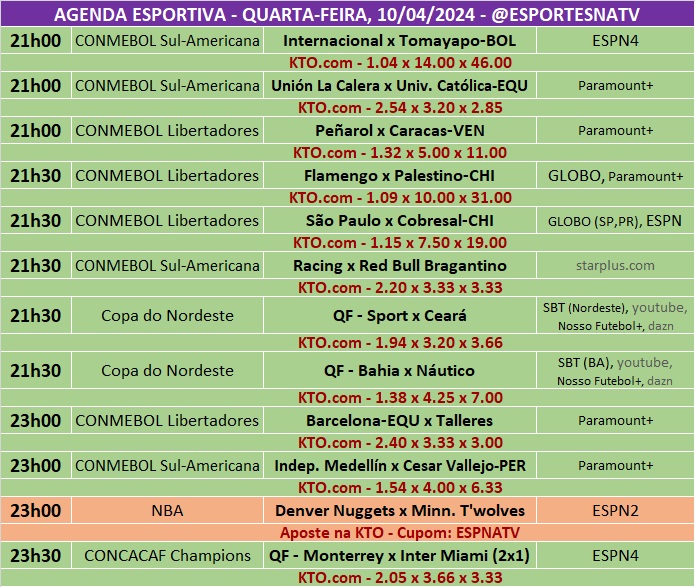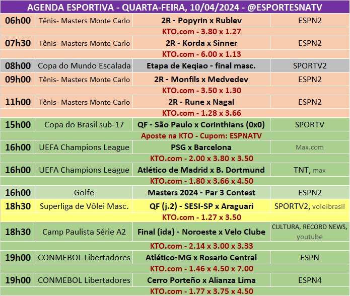 Confira a agenda esportiva mundial para essa quarta-feira, 10 de abril