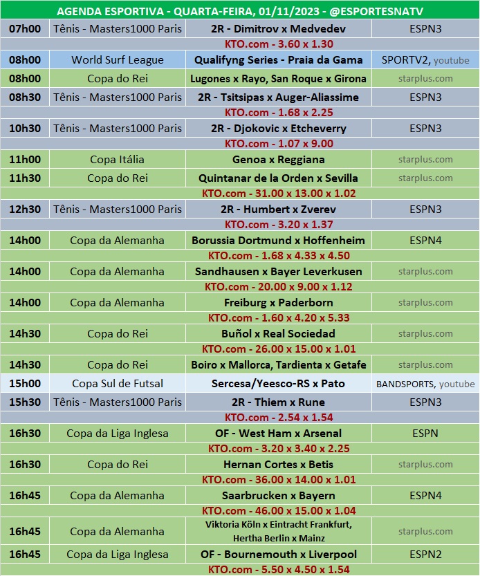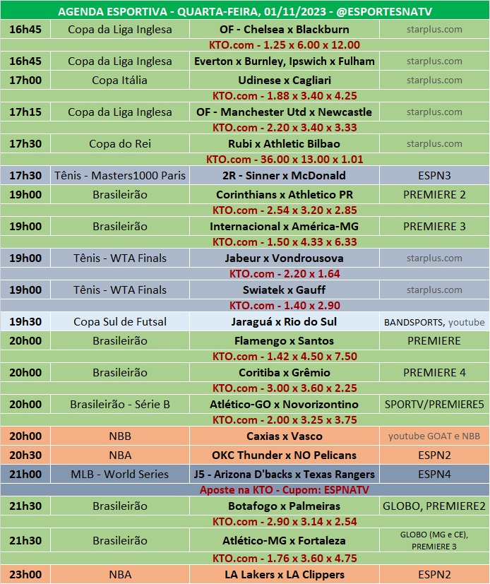 Confira a agenda esportiva mundial para essa quarta-feira, 1º de novembro