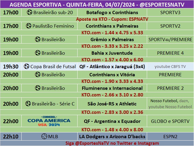 Confira a agenda esportiva mundial para essa quinta-feira, 4 de julho