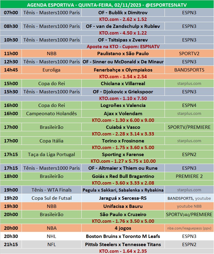 Confira a agenda esportiva mundial para essa quinta-feira, 2 de novembro