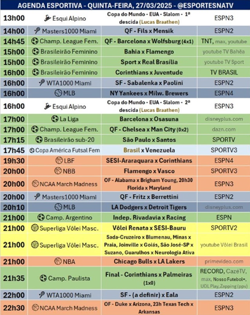 Confira a agenda esportiva mundial para essa quinta-feira, 27 de março