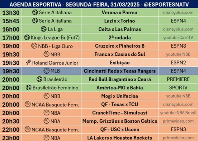Confira a agenda esportiva mundial para essa segunda-feira, 31 de março