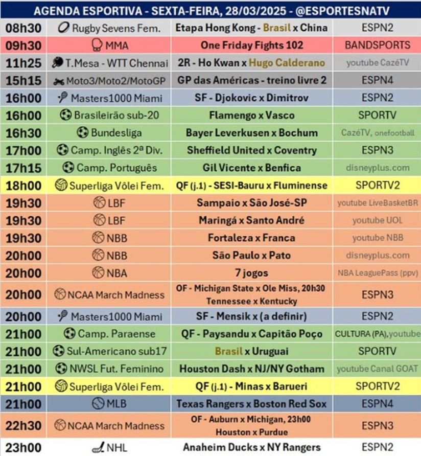 Confira a agenda esportiva mundial para essa sexta-feira, 28 de março