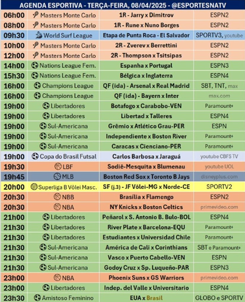 Confira a agenda esportiva mundial para essa terça-feira, 8 de abril