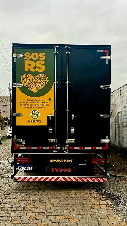 BANANAS – Na madrugada de sexta-feira (17), seguiu para Canoas, um caminhão com 500 caixas de banana doadas por produtores corupaenses e seis caixas com 900 cartas escritas pelos alunos da rede pública acompanhadas de chocolates. As doações têm como destino São Leopoldo e Canoas, sendo que cada cidade receberá 450 cartas.