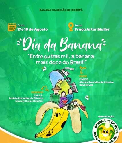A Praça Artur Müller, no centro de Corupá, é o local de realização do Dia da Banana, organizada pela Banana de Corupá – Doce por Natureza, com apoiadores, que acontece no sábado e domingo – 17 e 18 de agosto – com ampla programação. Às 8h de sábado começa a recepção dos cachos doados pelos bananicultores e meia hora depois a largada do passeio 4×4 – Rhino off Road “Trilha da Banana”, com chegada às 15h.