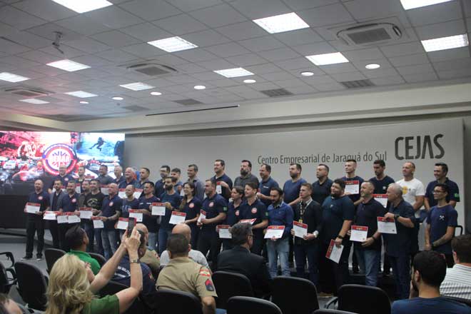 Autoridades civis e militares, diretoria, voluntários, apoiadores e convidados participaram no evento no Centro Empresarial de Jaraguá do Sul, na quinta-feira, dia 28. Os voluntários que foram ao Rio Grande do Sul receberam certificados e moedas comemorativas para marcar a participação no resgate de vítimas, onde a coragem superou o medo, levando solidariedade e esperança aos flagelados.