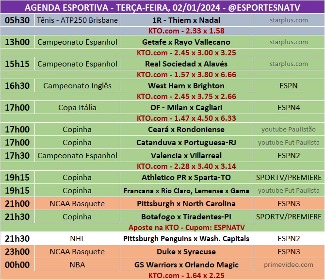 Saiba mais além do futebol: Confira a agenda esportiva mundial para essa terça-feira, 2 de janeiro