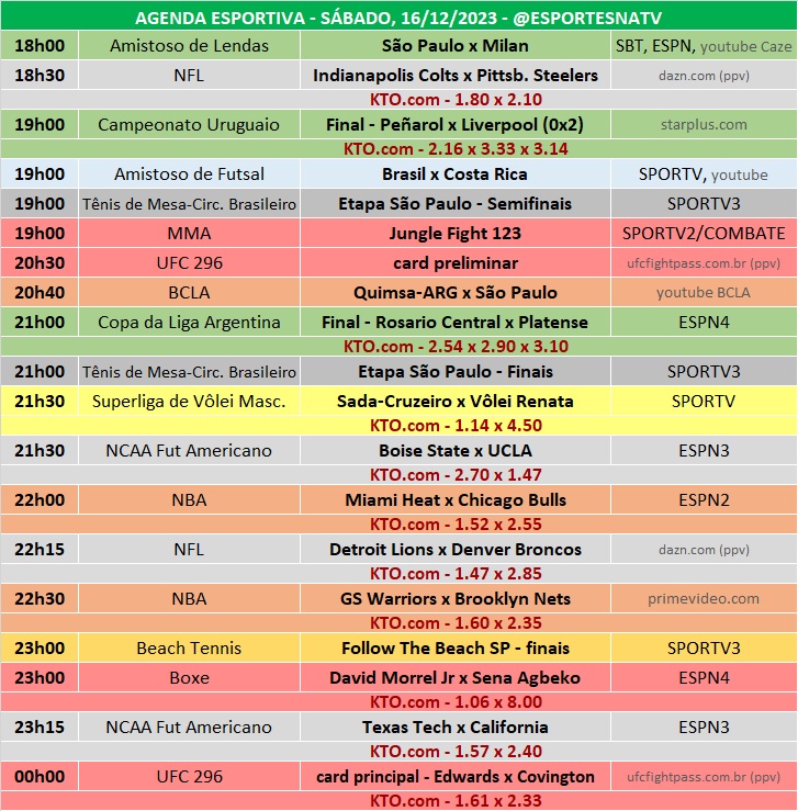 Saiba mais: Confira a agenda esportiva mundial para esse sábado, 16 de dezembro