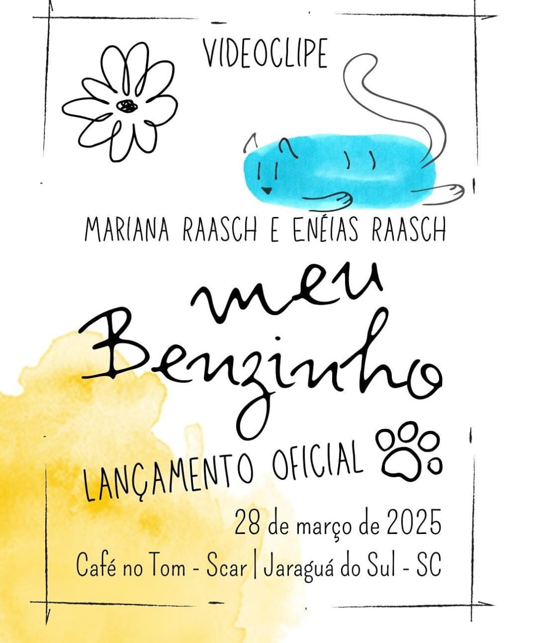 O Lançamento oficial do videoclipe “Meu Benzinho” do violonista Enéias Raazch com sua sobrinha e cantora Mariana Raasch acontece na noite desta sexta-feira (28), a partir das 19h30, no Café no Tom, na Sociedade Cultura Artística (Scar). A iniciativa tem apoio da Prefeitura, por meio da Secretaria de Cultura, Esporte e Lazer (Secel).