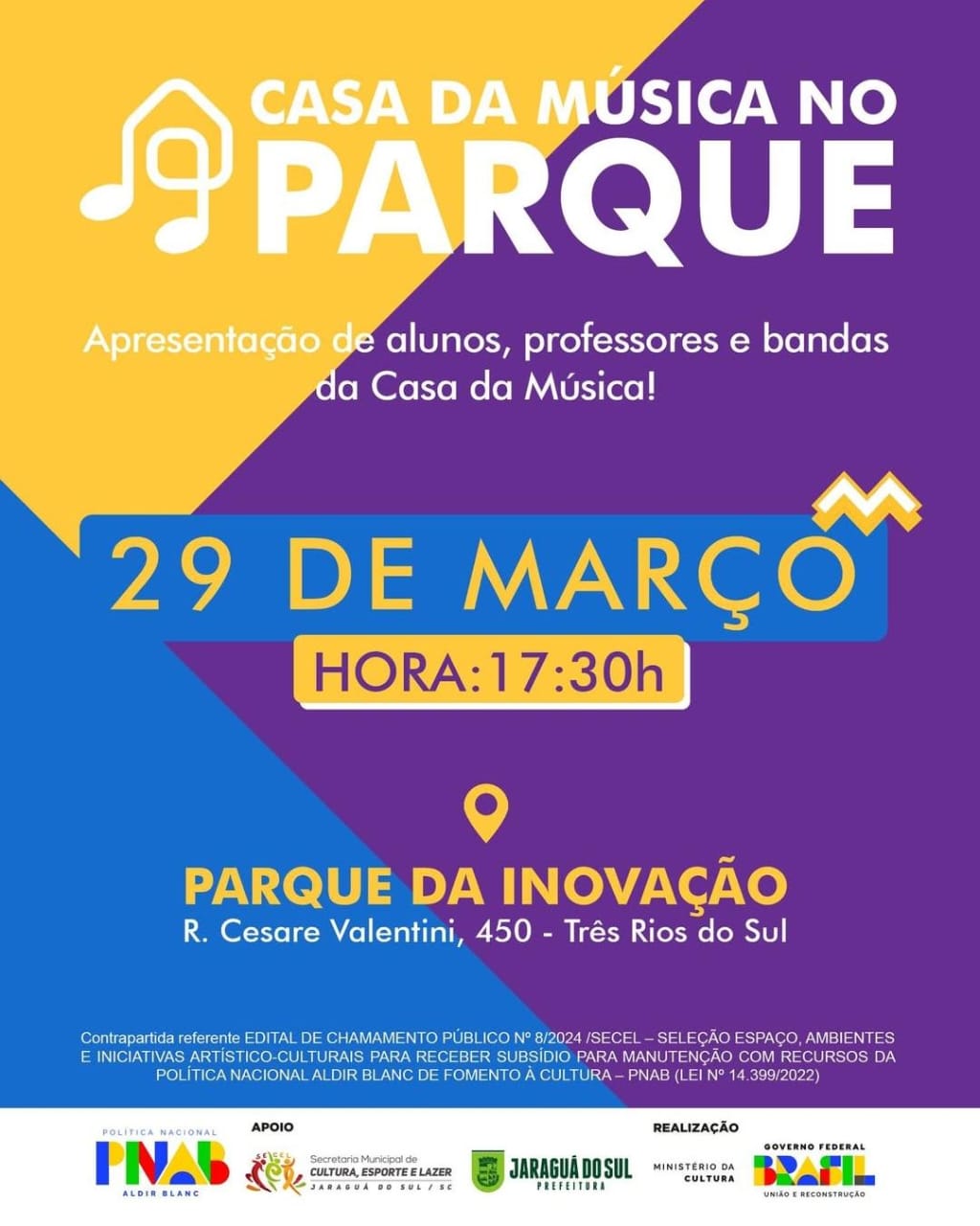 O Parque da Inovação, em Três Rios do Sul será palco das apresentações dos alunos, professores e bandas da Casa da Música neste sábado (29) a partir das 17h30. A iniciativa é subsidiada pelo Política Nacional Aldir Blanc de Fomento à Cultura (PNAB) sendo realizada pela Prefeitura de Jaraguá do Sul, por meio da Secretaria de Cultura, Esporte e Lazer (Secel).