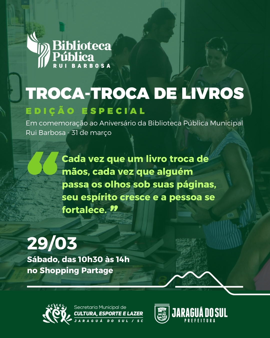 Em comemoração ao aniversário da Biblioteca Pública Rui Barbosa – no dia 31 deste mês – será promovida neste sábado (29), das 10 às 14 horas, a Troca-troca de Livros, no Shopping Partage. Quem quiser participar da iniciativa deve levar até dois livros de literatura infanto juvenil ou adulta. Não serão aceitos gibis, impressos em papel jornal ou danificados. Segundo a organização do evento “a troca de livros incentiva a sustentabilidade e o compartilhamento de interesses.”