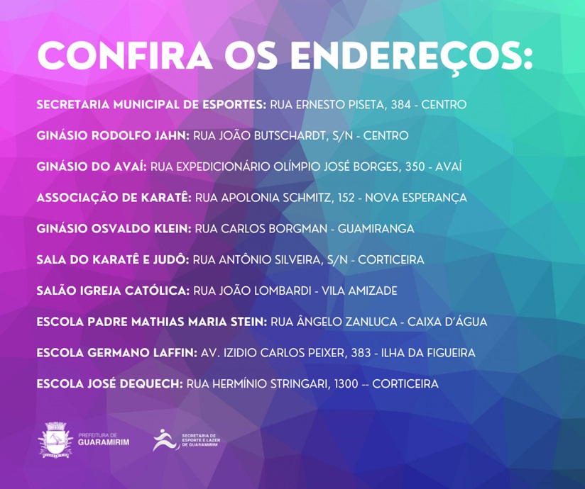 As escolinhas municipais de esportes de Guaramirim já retornaram suas atividades para o ano letivo de 2024 e estão com vagas abertas, são oferecidas diversas modalidades para crianças e adolescentes, como basquete, xadrez, judô, karatê, tênis de mesa, futsal e vôlei.