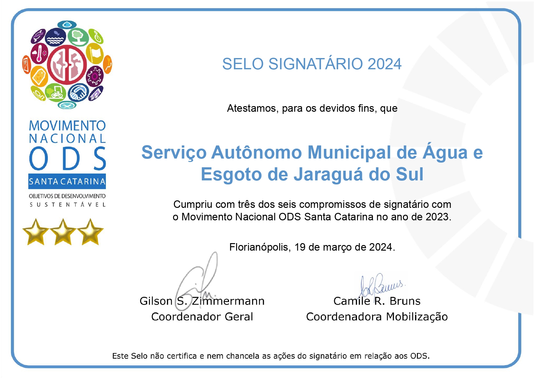 Referência na área de saneamento básico, o Samae de Jaraguá do Sul recebeu o Selo Signatário 2024 do Movimento Nacional dos Objetivos de Desenvolvimento Sustentável – ODS Santa Catarina.