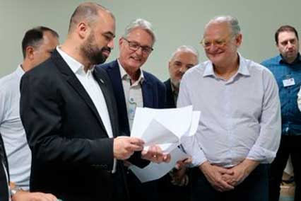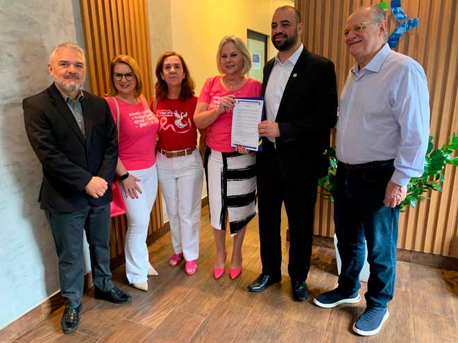 A vereadora e voluntária Nina Santin Camello, acompanhada do deputado Vicente Caropreso e do secretário municipal de Saúde, Rogério Luiz Silva, entregaram na sexta-feira (11) ao secretário de Estado da Saúde de Santa Catarina, Diogo Demarchi Silva, a moção que apela ao governo do Estado pela retomada das cirurgias de reparação de mama das pacientes mastectomizadas da região.