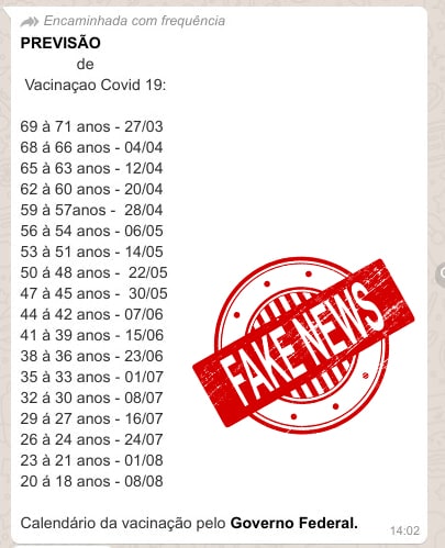 A secretaria de Saúde de Jaraguá do Sul informa que é falso a informação que circula nos grupos de WhatsApp trazendo um calendário da vacinação contra a Covid-19, conforme a faixa etária.