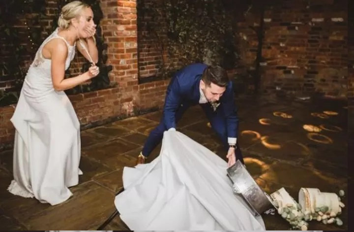 Após a tragédia, os convidados ajudaram o casal a recuperar as parte do bolo